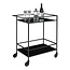 De bar trolley in zwart metaal en houtlookplaten met zwarte afwerking is een eigentijdse toevoeging aan je interieur. Het volledig zwarte design zorgt voor een strakke en stijlvolle uitstraling. Met een afmeting van 68 × 40 × 79 cm en een gewicht van 7,5 kg is de trolley stevig en toch goed verplaatsbaar. De twee planken bieden ruimte voor glazen, drankjes of decoratieve objecten, terwijl de wieltjes zorgen dat je hem eenvoudig naar de gewenste plek kunt rijden. Ideaal tijdens een borrel of etentje, maar ook geschikt als decoratief meubelstuk in de woonkamer of eetkamer. Dit model komt prachtig tot zijn recht in een industrieel, modern of hotel chique interieur.