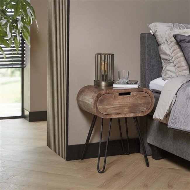 Breng natuurlijke elegantie in je slaapkamer met dit unieke nachtkastje, vervaardigd uit massief mangohout met een prachtige zandkleurige afwerking. De robuuste constructie combineert duurzaamheid met stijl. Het nachtkastje is voorzien van metalen frame met een zwarte poedercoating, evenals afgeronde hoeken voor een trendy look – een echte must-have!