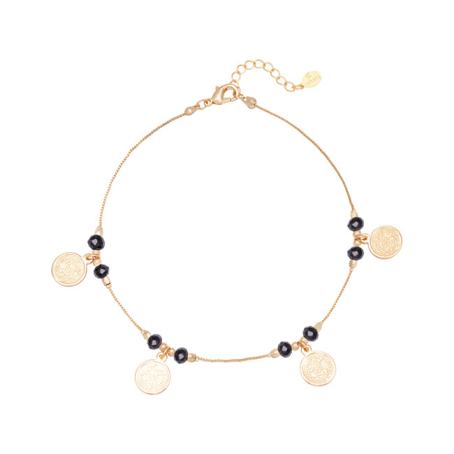 Betover met elegantie en stijl met onze prachtige goudkleurige enkelband, verfraaid met zwarte kristallen kralen en munt bedels. Een absolute must-have voor de zomer! Ons enkelbandje is verstelbaar in lengte, waardoor het perfect past om elke enkel.