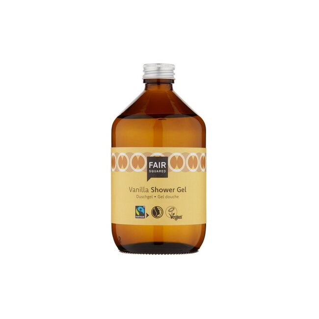 Verpakt in een prachtige amber glazen fles. Fair Square biedt ook handige zeeppompjes aan waarmee je de douchegel handig kunt doseren.