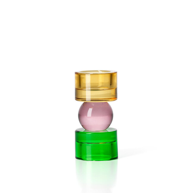 Een subtiel spel van kleur, licht en vorm komt samen in deze glazen kandelaar, waarin balans en verfijning centraal staan. De combinatie van amber, roze en groene tinten geeft het glas een levendige maar rustige uitstraling, die moeiteloos sfeer toevoegt aan elke ruimte.