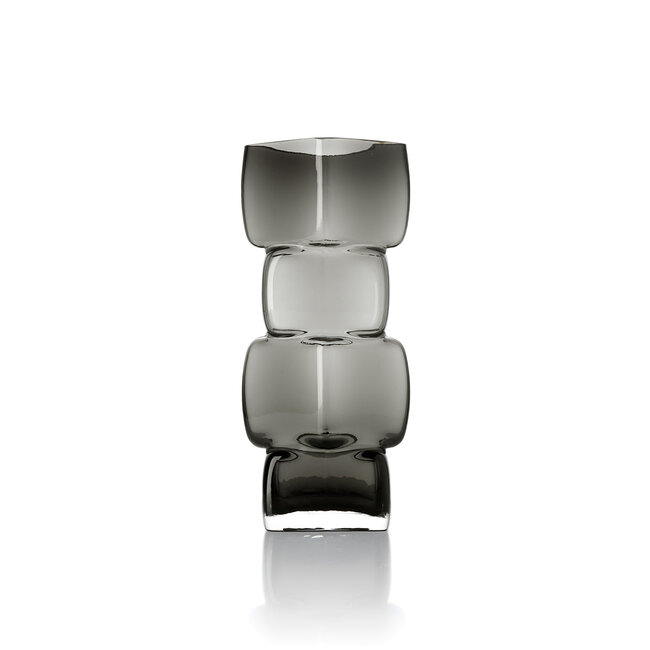Zachte blokvormen en een diepe grijstint geven deze glazen vaas een krachtig en verfijnd karakter. De opbouw van afgeronde kubusvormen zorgt voor een speels ritme, terwijl het geheel rustig en in balans blijft.