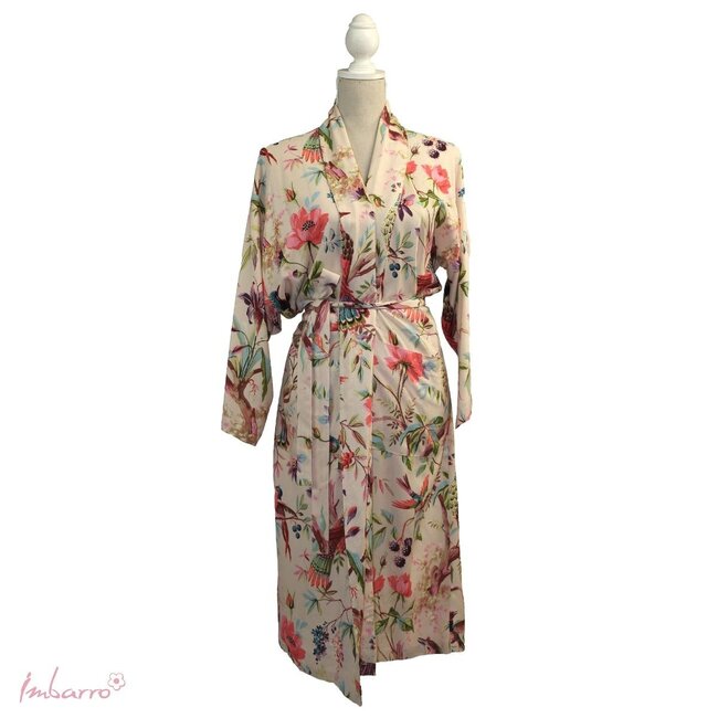 Breng een vleugje elegantie en kleur in je dagelijkse momenten met de Kimono Royal in Paradise print. De zachte ecru achtergrond vormt een prachtig canvas voor de levendige bloemen en subtiele vogeldetails in warme rood- en multikleuren. Dit geeft de kimono een verfijnde en stijlvolle uitstraling die perfect past bij een elegante boudoirstijl.