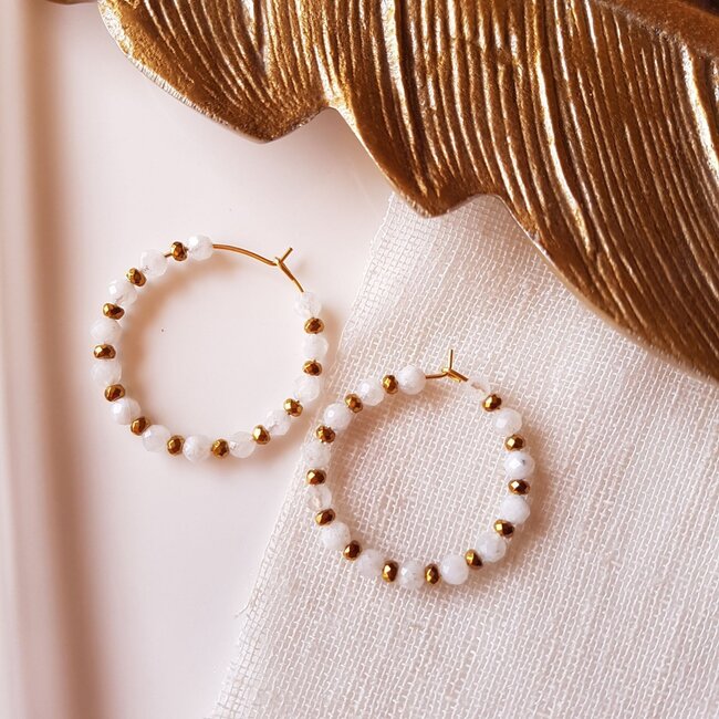 Gouden roestvrijstalen oorbellen, prachtig versierd met maanstenen en hematieten. Een perfect geschenkidee! Deze oorbellen hebben een diameter van 3 cm, ze worden geleverd in een elegant etui.