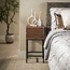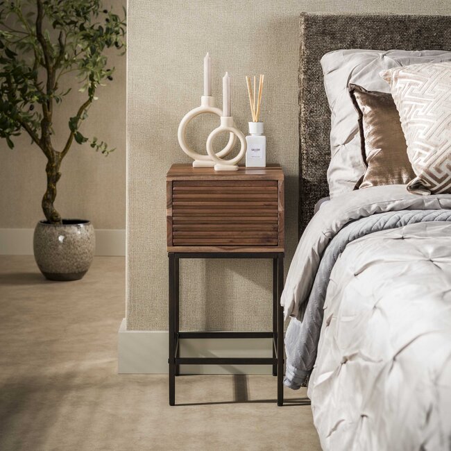 Het nachtkastje staat op een stevig metalen frame met een bronskleurige afwerking. De combinatie van hout en metaal zorgt voor een moderne en licht industriële uitstraling die goed past in verschillende interieurstijlen.