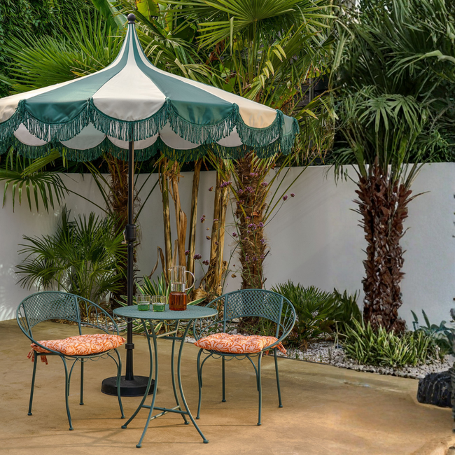 De sierlijke franjes langs de rand geven de parasol een elegante en licht speelse uitstraling, waardoor hij direct opvalt zonder overheersend te zijn. Ideaal om een knusse zithoek te creëren waar je kunt genieten van lange zomerdagen.