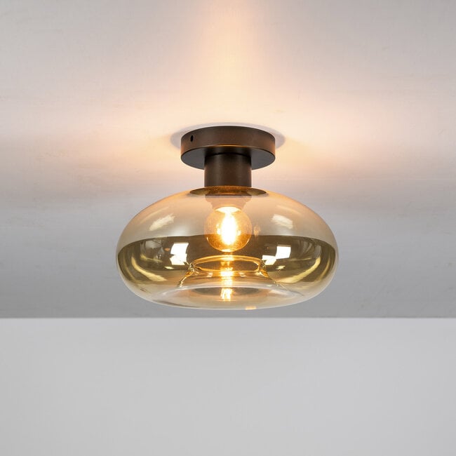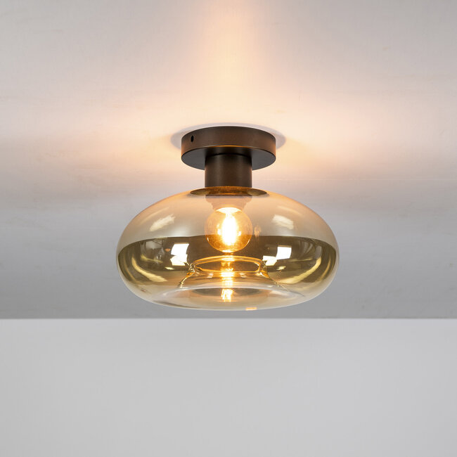 Plafondlamp Soll combineert elegantie met eenvoud. De ronde kap van amberkleurig glas zorgt voor een warme lichtspreiding, ideaal voor wie houdt van een sfeervol interieur. Het metalen armatuur met bronze finish geeft de lamp een moderne en tijdloze uitstraling. Dankzij het compacte formaat is deze lamp perfect voor ruimtes met een lager plafond, zoals een hal of slaapkamer. Gebruik een LED-lichtbron voor energiezuinig en sfeervol licht. Deze lamp past prachtig bij andere verlichting uit de Soll-serie.