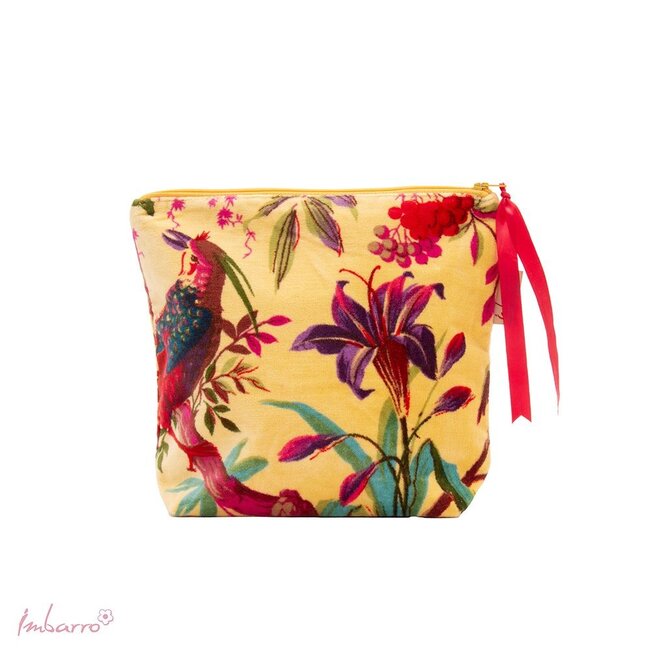 Kleurrijke details en een zachte uitstraling komen samen in deze stijlvolle pouch met de levendige Paradise print. Bloemen, bladeren en sierlijke vogels komen prachtig tot leven op de warme honinggele achtergrond en geven de pouch een speelse en elegante uitstraling.