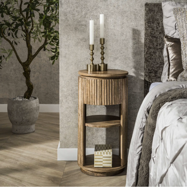 Dit nachtkastje uit de Wave-serie brengt een gevoel van rust en natuurlijkheid in de slaapkamer. Het is vervaardigd uit massief mangohout en afgewerkt in een warme zandkleur die gemakkelijk te combineren is met verschillende interieurstijlen. Het ronde ontwerp en het subtiele golfpatroon rondom geven het meubel een zachte, stijlvolle uitstraling.