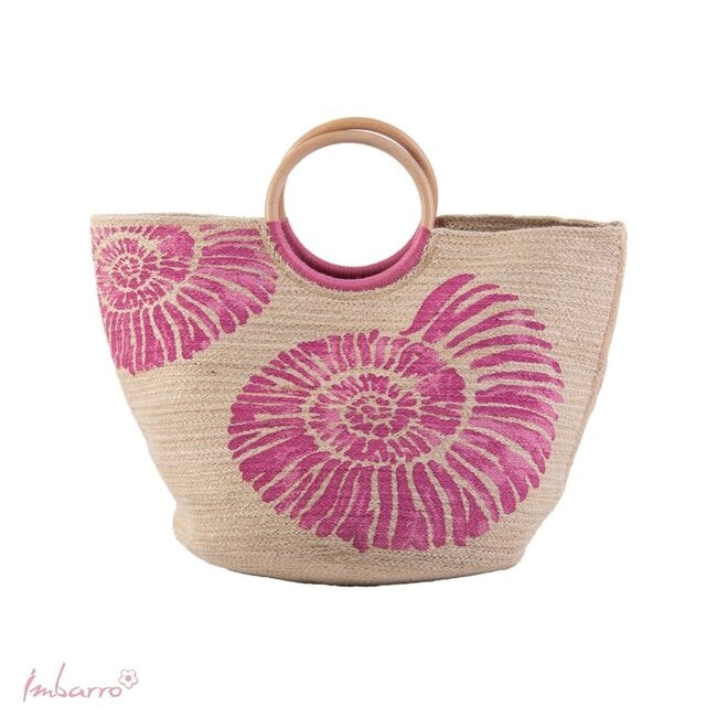 Deze stijlvolle shopper combineert natuurlijke materialen met een elegante en zomerse uitstraling. De raffia tas met roze print valt meteen op door het ronde houten handvat en de verfijnde details zoals schelpjes en subtiele gouden accenten.