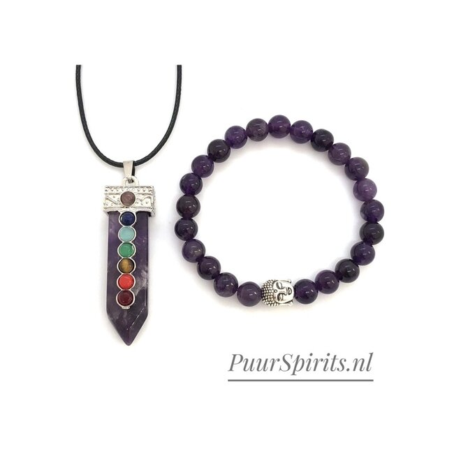 Ontdek deze prachtige set vervaardigd van Amethist en 7 chakra halfedelstenen. De ketting strekt zich uit over 45 cm met een 0,5 cm dikke steen. De bijbehorende armband, met een lengte van 19 cm, bestaat uit 23 kralen van 8 mm en één grotere kraal van 1 cm.