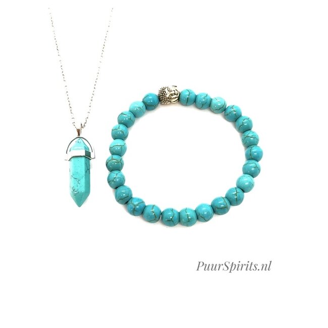 Ontdek de schoonheid van ons betoverende sieradensetje met een turquoise ketting inclusief hanger en een armband met een zilveren Boeddhahoofd. Voeg stijl en spiritualiteit toe aan je look.