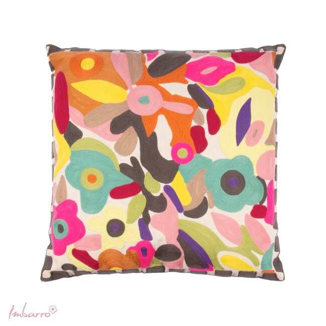 Dit sierkussen brengt een speelse mix van kleur en detail samen in een opvallend en stijlvol ontwerp. De combinatie van een levendige bloemenprint en subtiel borduurwerk geeft het kussen een bijna kunstzinnige uitstraling, zonder dat het zijn zachtheid en warmte verliest.