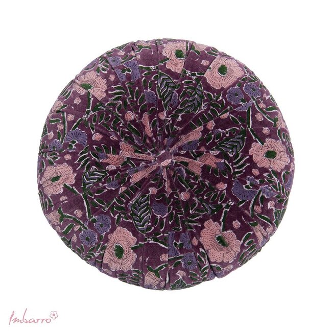 De gemêleerde paarstinten samen met de bloemenprint zorgen voor een karaktervolle uitstraling die zowel modern als klassiek mooi past. De geplooide afwerking en de knoop in het midden geven het kussen een chique, vintage twist. Ideaal om neer te leggen op de bank, in een fauteuil of als detail op bed.