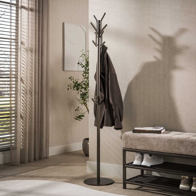 Houd de hal netjes en overzichtelijk met deze stijlvolle staande kapstok. Het slanke ontwerp neemt weinig ruimte in en biedt toch voldoende plek om jassen, tassen en accessoires overzichtelijk op te hangen.