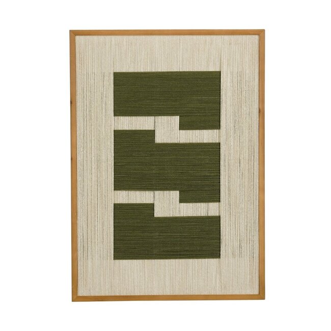 Deze wanddecoratie straalt rust en verfijning uit door het gebruik van zachte groentinten en een strak grafisch patroon. Het lijnenspel zorgt voor een rustig ritme dat de ruimte visueel verrijkt zonder te overheersen. De lichte achtergrond brengt balans en laat de groene vormen op een natuurlijke manier naar voren komen.