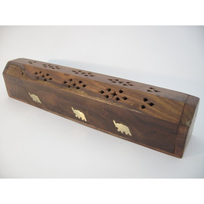 Houten wierookhouder kistje met olifanten afgebeeld.