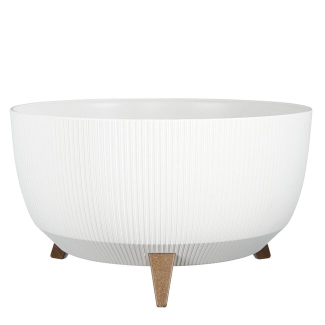 Deze grote witte bloempot op poten is een frisse en duurzame blikvanger voor binnen en buiten. De zachte kleur zorgt voor rust en licht in elke ruimte, terwijl het moderne, geribbelde oppervlak de pot een eigentijdse uitstraling geeft. Gemaakt van gerecycled kunststof en houtmix is de pot licht van gewicht, maar stevig genoeg voor dagelijks gebruik. Dankzij de UV- en vorstbestendige eigenschappen is hij perfect geschikt voor elk seizoen. De uitneembare plug zorgt voor een goede afwatering wanneer nodig – ideaal voor gezonde planten, binnen of buiten. Met een diameter van 47 cm biedt deze bloempot voldoende ruimte voor grotere kamer- of buitenplanten zoals een bananenplant, olijfboompje of kleurrijke bloeier.